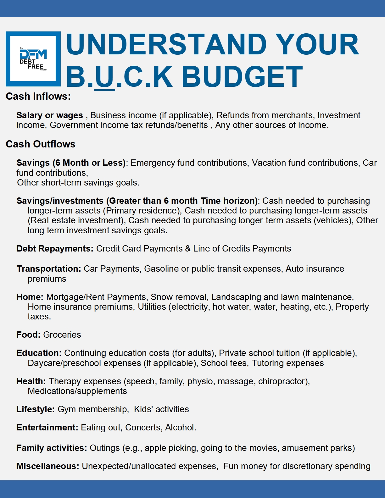 The net cash flow represents the disparity between your total cash inflows and total cash outflows during that specific period. It serves as an indicator of the change in your available cash within that timeframe. Maintaining a balance is paramount in a B.U.C.K Budget, as the net cash flow should always equate to zero. When managing your finances, it is essential to consider your money in terms of three key aspects: